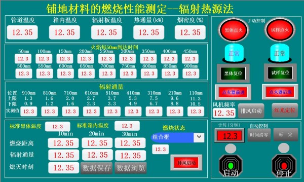 用热通量计连接冷却水源(15~25)℃ 在410mm的位置测量辐射通量。插入热通量计,让它的探测表面与模拟样品面平行30S后读数,如果辐射通量为(5.1±0.2)kw/㎡,就可以进行辐射通量校准了,如果达不到,则需要调节辐射板的燃气/空气流量。热通量计在每一次新的读数前应让辐射板的燃气流量稳定至少10min。 依次在每个孔中插入热通量计,起始点为110mm,终点为 910mm。 确保热通量计的探测面和测试时间满足上述的规定要求。在910mm点校准完毕后,再在410mm点测量辐射通量,检验在此测试过程中辐射通量是否在允许范围以内。 如果此辐射通量规定的范围内,那么试验装置的校准就完成了。如果不在规定范围内,则需要调节燃气流量,并至少稳定10min确保试验箱体温度稳定。再按程序重复校准直到辐射通量满足要求。要调节试件热端(110mm处)的辐射通量,通常是只需改变燃气流量,而调节试件冷端(910mm处)的辐射通量,可能需要同时改变燃气和空气的流量。 移走模拟样品,关闭样品出入门,5min后分别校准辐射板的黑体温度和试验箱体温度。 以后每次试验就以此辐射板黑体温度及试验箱体温度为试验的前提条件。 4.0试验程序 在试验箱中,在风机打开、试件出入门关闭情况下测量箱体烟道内的气体流速,并调节使其满足(2.5±0.2)m/s,移走模拟样品,关闭试样出入门,点燃辐射板,让装置预热至少 1小时,直到箱体温度稳定。 观察黑体温度和箱体温度,黑体温度 比 标准黑体 的偏差应在±5℃范围内,箱体温度 比 标准箱内 偏差应在±10℃范围内。 如果黑体温度和箱体温度超出了给定的温度范围,那么应调整辐射板燃气/空气的输入量。在新的温度测试之前,试验装置需稳定至少15 min,当试验温度达到给定温度要求时,就可进行试验了。 如果要测量烟气,那么应校准烟密度系统。 将试件(包括它的底层材料和基材)安装在试件夹上。然后在组合件背后添加钢夹并紧固螺钉,或者根据样品特性及使用说明书使用其他方法安装。对于多层纺织地毯的试验,可在试验前使用真空吸尘器进行表面清洁,然后把试件安装在夹具内,再放在滑动平台上。 放好试件后,关闭试件出入门。